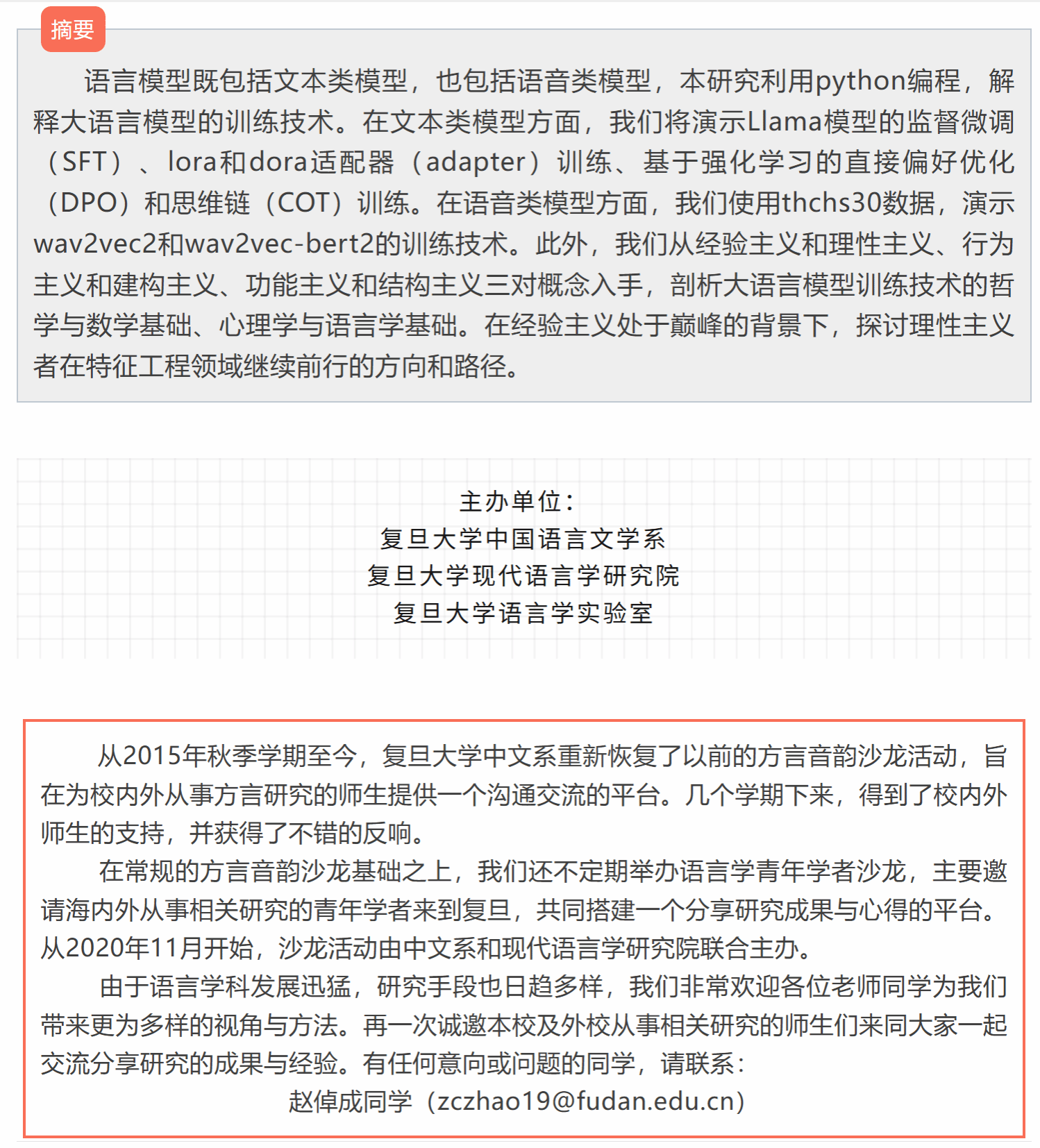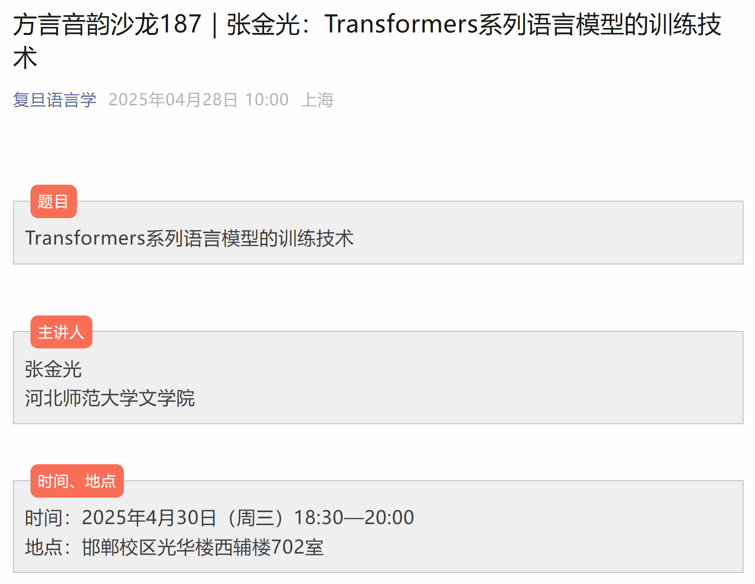 讲座论坛 当前位置: 首 页 > 学术研究 > 讲座论坛 方言音韵沙龙:Transformers系列语言模型的训练技术 浏览量:时间:2025-09-15 复旦现代语言学论坛 复旦现代语言学论坛由复旦大学现代语言学研究院主办。论坛以语言学的跨学科研究为主要特色,不定期邀请国内外知名学者、学界精英共同探讨言语听觉科学、神经语言学、演化语言学、计算语言学、地理语言学等领域的前沿问题。通过跨学科的交流与碰撞,探索现代语言学研究的多元化路径,推动语言学的跨学科发展。