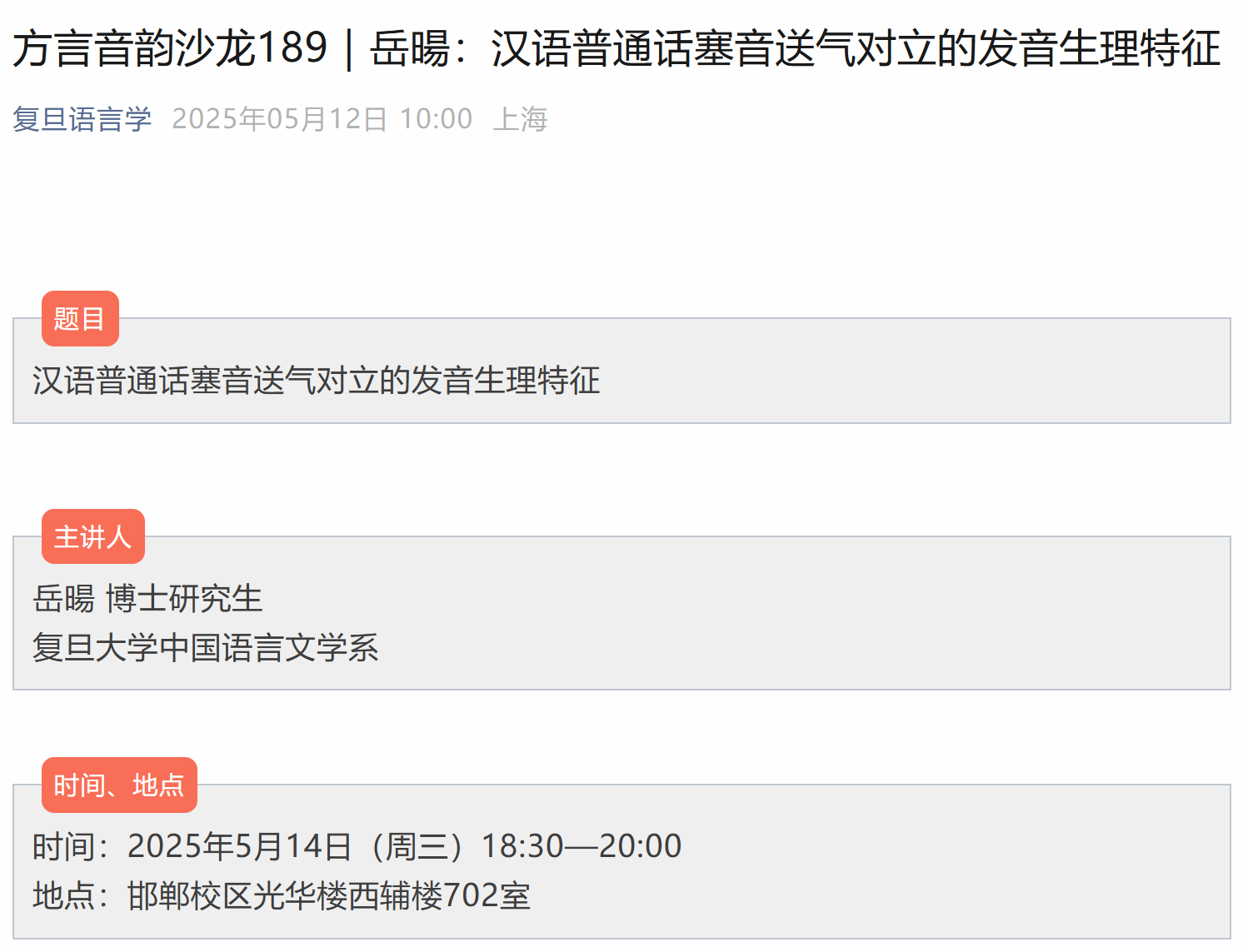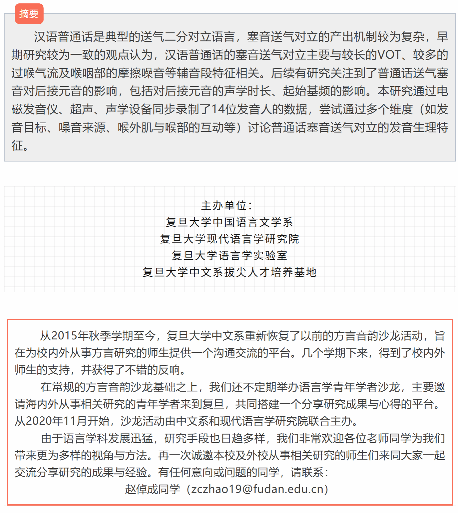 讲座论坛 当前位置: 首 页 > 学术研究 > 讲座论坛 方言音韵沙龙:汉语普通话塞音送气对立的发音生理特征 浏览量:时间:2025-09-15 复旦现代语言学论坛 复旦现代语言学论坛由复旦大学现代语言学研究院主办。论坛以语言学的跨学科研究为主要特色,不定期邀请国内外知名学者、学界精英共同探讨言语听觉科学、神经语言学、演化语言学、计算语言学、地理语言学等领域的前沿问题。通过跨学科的交流与碰撞,探索现代语言学研究的多元化路径,推动语言学的跨学科发展。