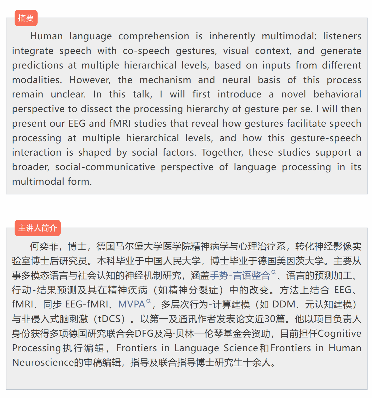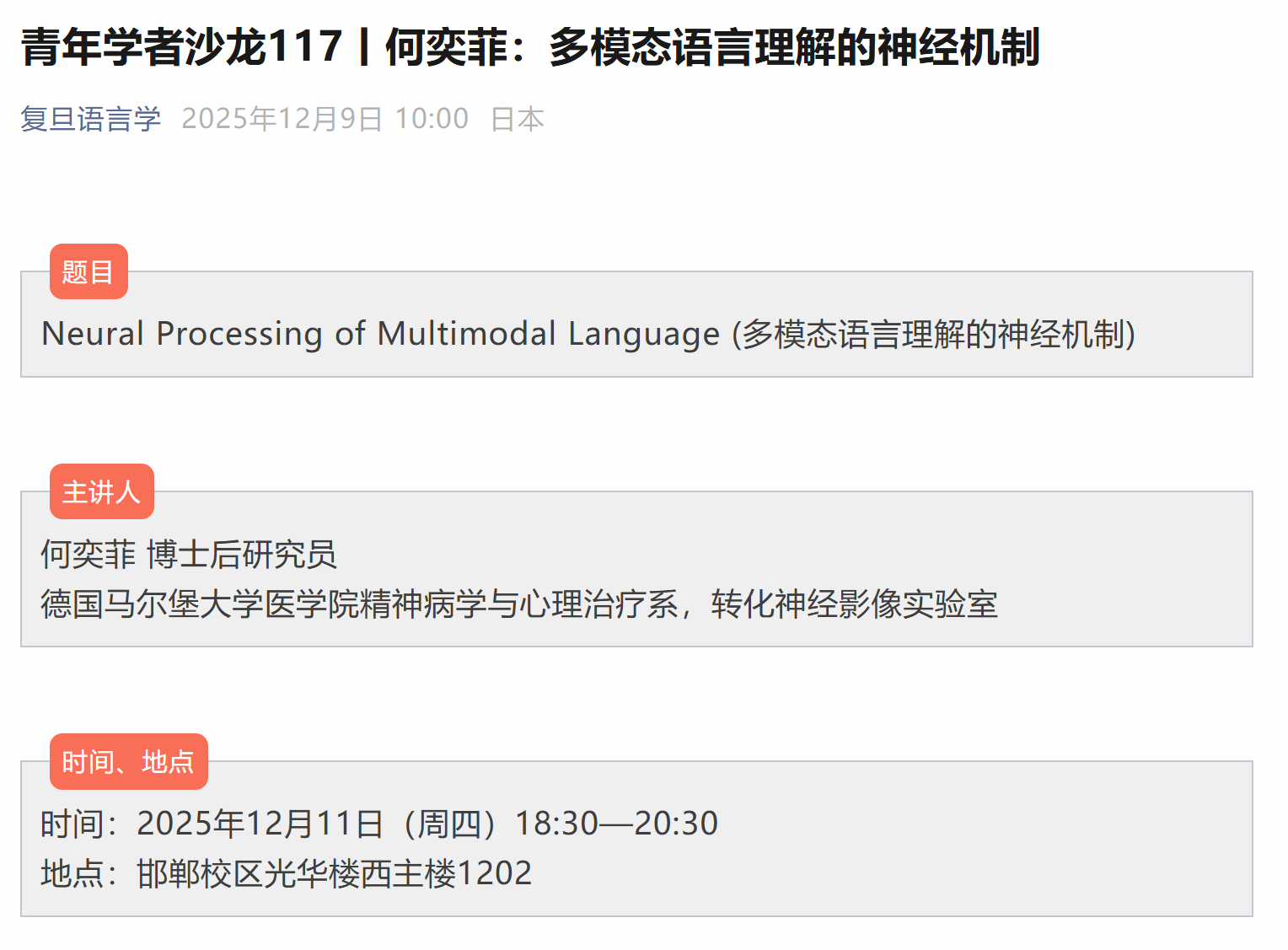 讲座论坛 当前位置: 首 页 > 学术研究 > 讲座论坛 青年学者沙龙:多模态语言理解的神经机制 浏览量:时间:2025-12-25 复旦现代语言学论坛 复旦现代语言学论坛由复旦大学现代语言学研究院主办。论坛以语言学的跨学科研究为主要特色,不定期邀请国内外知名学者、学界精英共同探讨言语听觉科学、神经语言学、演化语言学、计算语言学、地理语言学等领域的前沿问题。通过跨学科的交流与碰撞,探索现代语言学研究的多元化路径,推动语言学的跨学科发展。