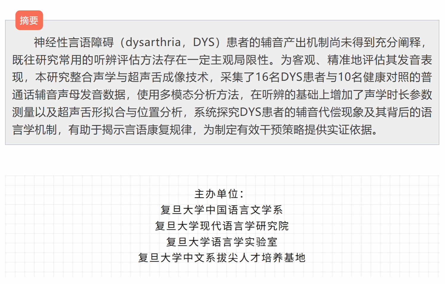 讲座论坛 当前位置: 首 页 > 学术研究 > 讲座论坛 方言音韵沙龙:神经性言语障碍患者普通话辅音产出研究 浏览量:时间:2025-12-31 复旦现代语言学论坛 复旦现代语言学论坛由复旦大学现代语言学研究院主办。论坛以语言学的跨学科研究为主要特色,不定期邀请国内外知名学者、学界精英共同探讨言语听觉科学、神经语言学、演化语言学、计算语言学、地理语言学等领域的前沿问题。通过跨学科的交流与碰撞,探索现代语言学研究的多元化路径,推动语言学的跨学科发展。