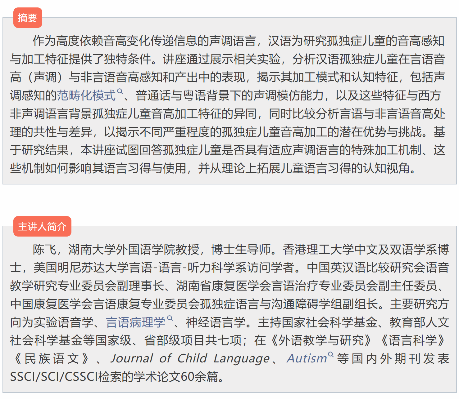 讲座论坛 当前位置: 首 页 > 学术研究 > 讲座论坛 青年学者沙龙:汉语背景孤独症儿童言语加工机制及其对语言习得理论的启示 浏览量:时间:2025-12-31 复旦现代语言学论坛 复旦现代语言学论坛由复旦大学现代语言学研究院主办。论坛以语言学的跨学科研究为主要特色,不定期邀请国内外知名学者、学界精英共同探讨言语听觉科学、神经语言学、演化语言学、计算语言学、地理语言学等领域的前沿问题。通过跨学科的交流与碰撞,探索现代语言学研究的多元化路径,推动语言学的跨学科发展。
