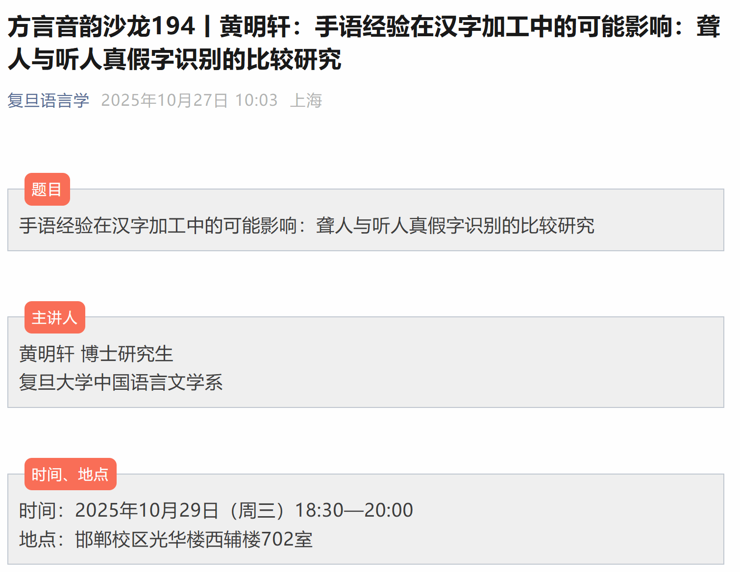 讲座论坛 当前位置: 首 页 > 学术研究 > 讲座论坛 方言音韵沙龙:手语经验在汉字加工中的可能影响:聋人与听人真假字识别的比较研究 浏览量:时间:2025-12-31 复旦现代语言学论坛 复旦现代语言学论坛由复旦大学现代语言学研究院主办。论坛以语言学的跨学科研究为主要特色,不定期邀请国内外知名学者、学界精英共同探讨言语听觉科学、神经语言学、演化语言学、计算语言学、地理语言学等领域的前沿问题。通过跨学科的交流与碰撞,探索现代语言学研究的多元化路径,推动语言学的跨学科发展。