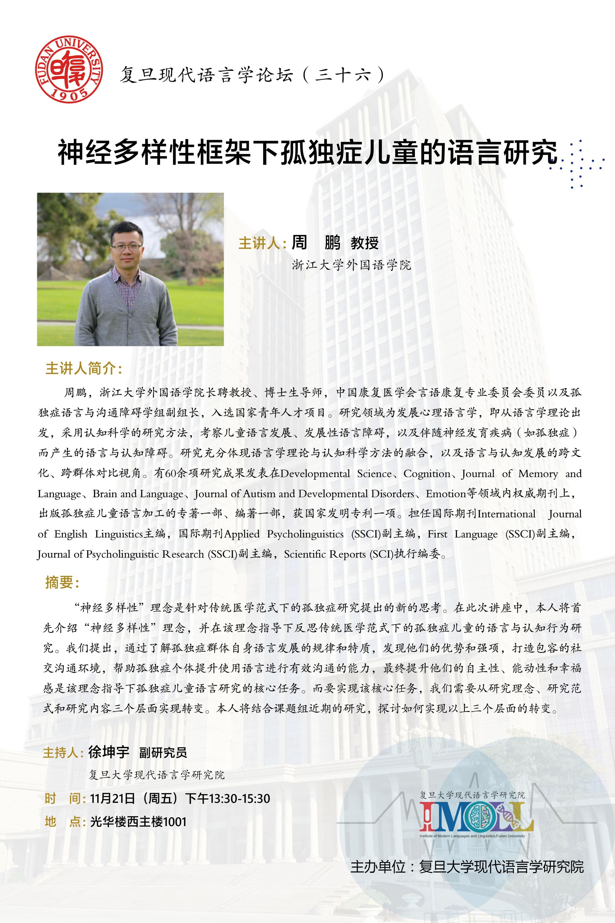 讲座论坛 当前位置: 首 页 > 学术研究 > 讲座论坛 讲座:神经多样性框架下孤独症儿童的语言研究 浏览量:时间:2025-12-31 复旦现代语言学论坛 复旦现代语言学论坛由复旦大学现代语言学研究院主办。论坛以语言学的跨学科研究为主要特色,不定期邀请国内外知名学者、学界精英共同探讨言语听觉科学、神经语言学、演化语言学、计算语言学、地理语言学等领域的前沿问题。通过跨学科的交流与碰撞,探索现代语言学研究的多元化路径,推动语言学的跨学科发展。