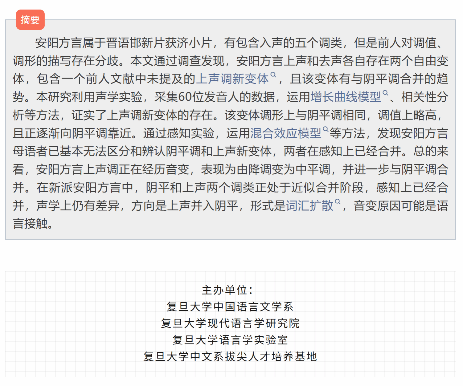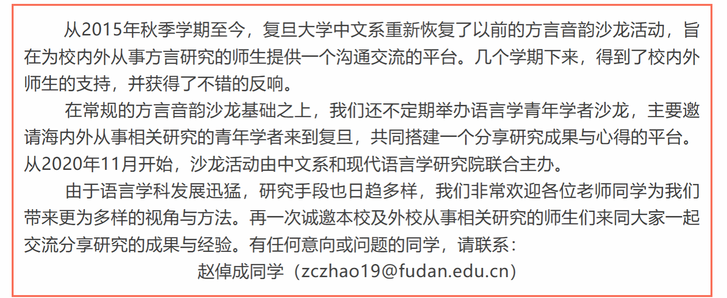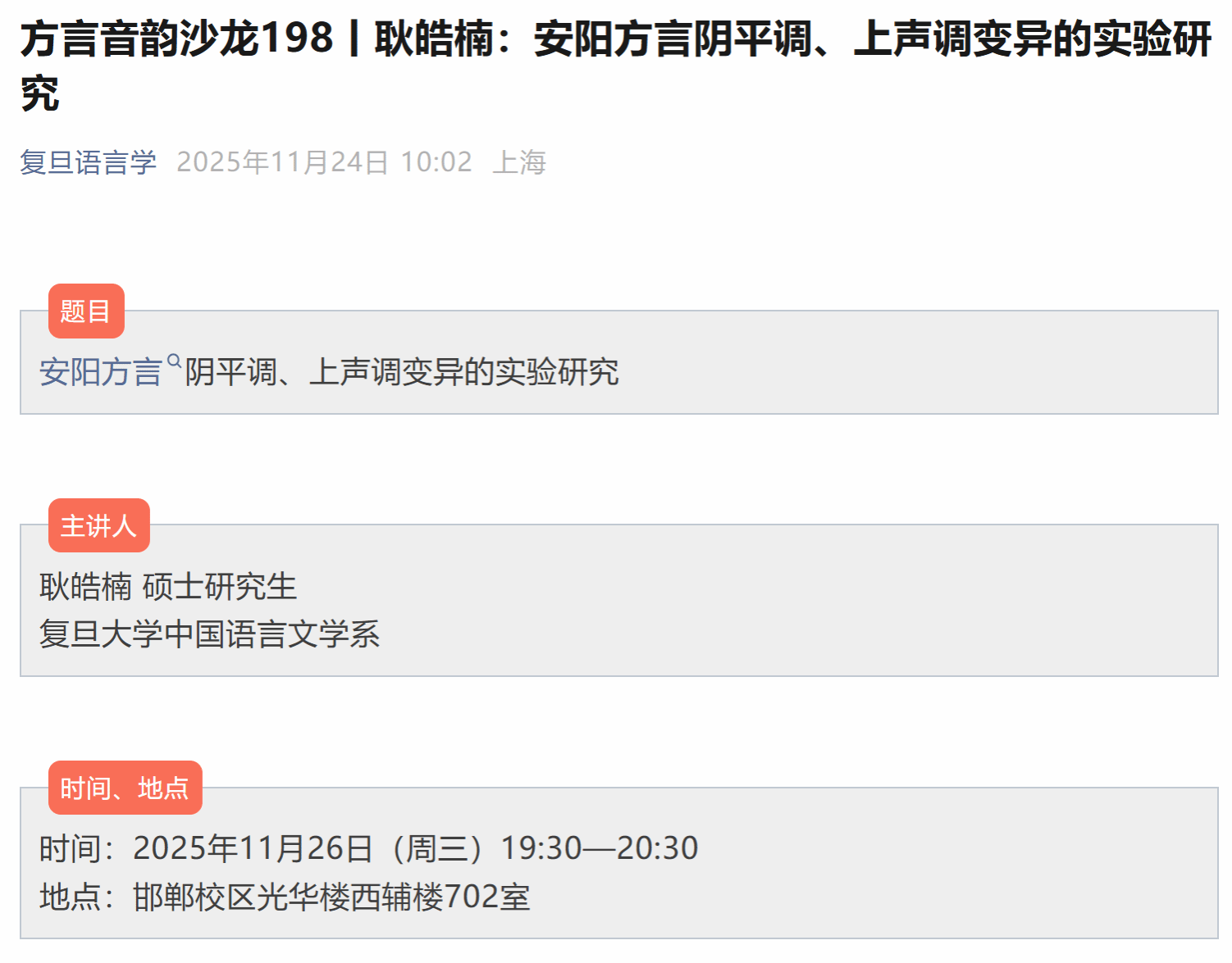 讲座论坛 当前位置: 首 页 > 学术研究 > 讲座论坛 方言音韵沙龙:安阳方言阴平调、上声调变异的实验研究 浏览量:时间:2025-12-31 复旦现代语言学论坛 复旦现代语言学论坛由复旦大学现代语言学研究院主办。论坛以语言学的跨学科研究为主要特色,不定期邀请国内外知名学者、学界精英共同探讨言语听觉科学、神经语言学、演化语言学、计算语言学、地理语言学等领域的前沿问题。通过跨学科的交流与碰撞,探索现代语言学研究的多元化路径,推动语言学的跨学科发展。