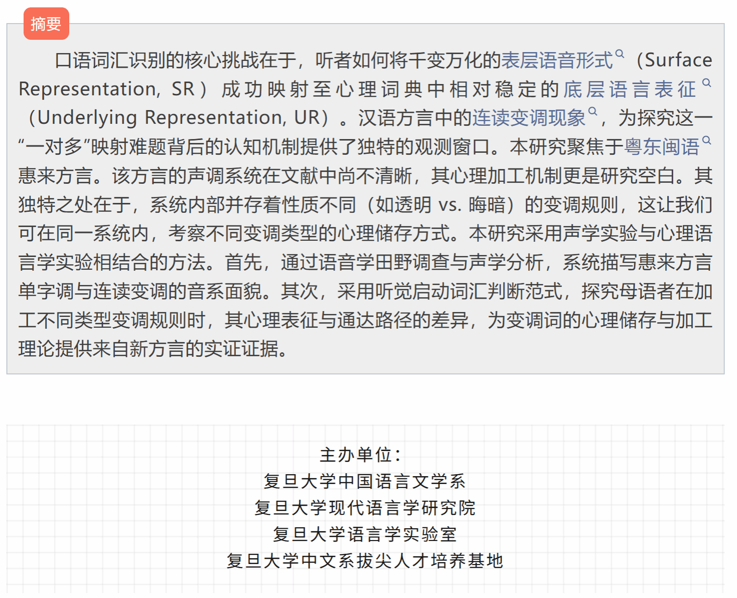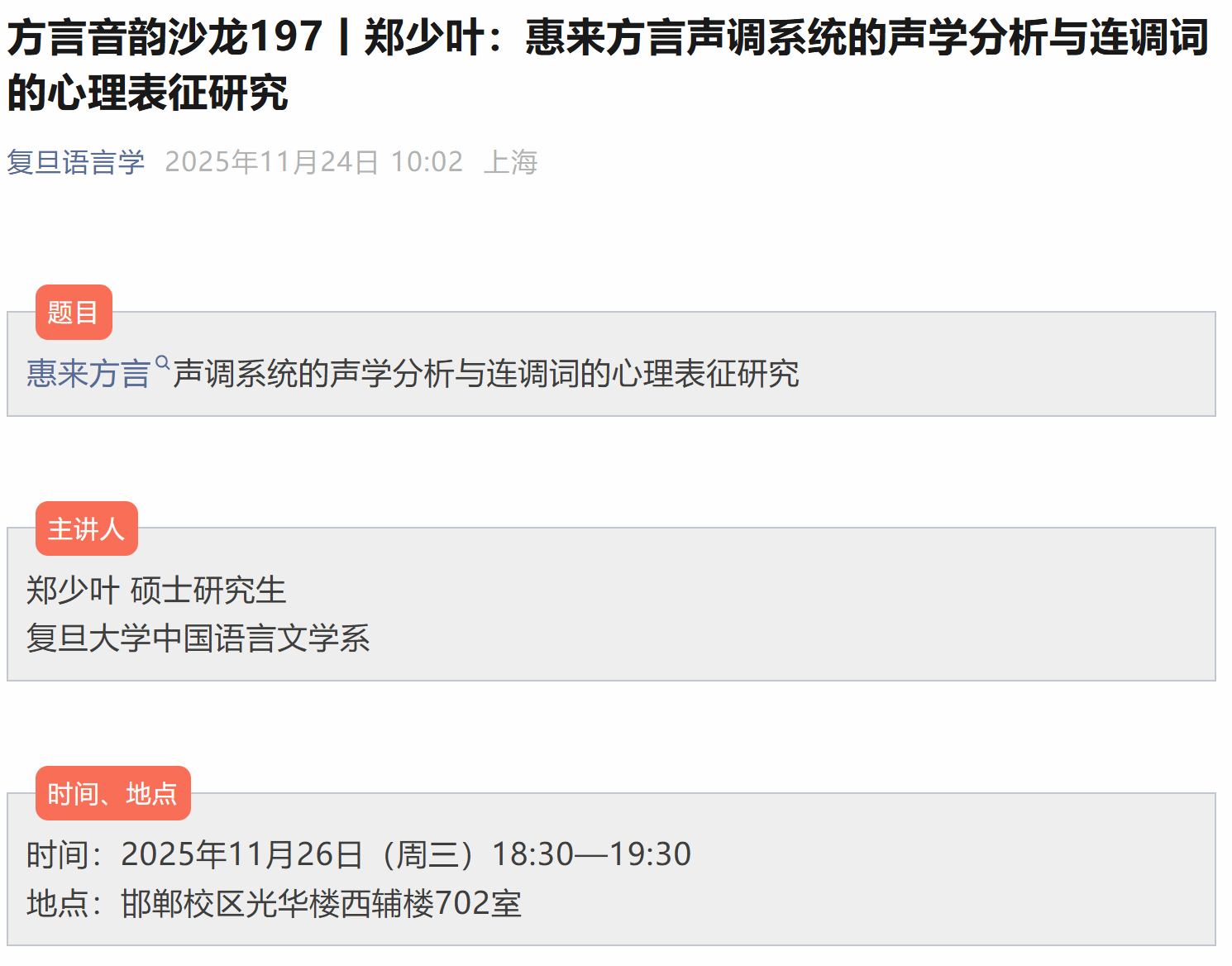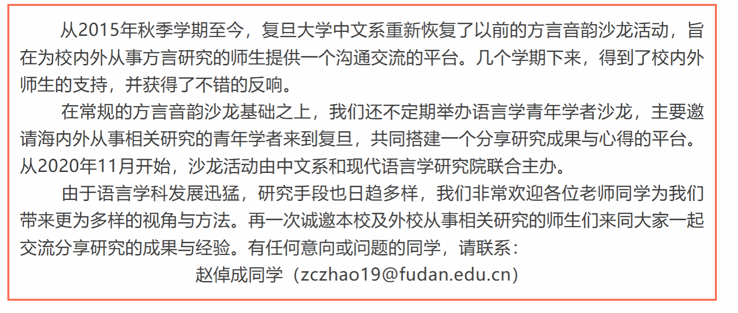 讲座论坛 当前位置: 首 页 > 学术研究 > 讲座论坛 方言音韵沙龙:惠来方言声调系统的声学分析与连调词的心理表征研究 浏览量:时间:2025-12-31 复旦现代语言学论坛 复旦现代语言学论坛由复旦大学现代语言学研究院主办。论坛以语言学的跨学科研究为主要特色,不定期邀请国内外知名学者、学界精英共同探讨言语听觉科学、神经语言学、演化语言学、计算语言学、地理语言学等领域的前沿问题。通过跨学科的交流与碰撞,探索现代语言学研究的多元化路径,推动语言学的跨学科发展。