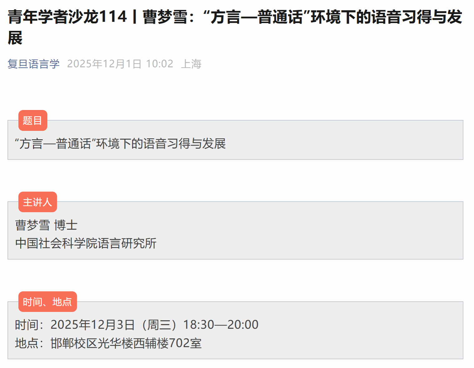讲座论坛 当前位置: 首 页 > 学术研究 > 讲座论坛 青年学者沙龙:“方言—普通话”环境下的语音习得与发展 浏览量:时间:2025-12-31 复旦现代语言学论坛 复旦现代语言学论坛由复旦大学现代语言学研究院主办。论坛以语言学的跨学科研究为主要特色,不定期邀请国内外知名学者、学界精英共同探讨言语听觉科学、神经语言学、演化语言学、计算语言学、地理语言学等领域的前沿问题。通过跨学科的交流与碰撞,探索现代语言学研究的多元化路径,推动语言学的跨学科发展。