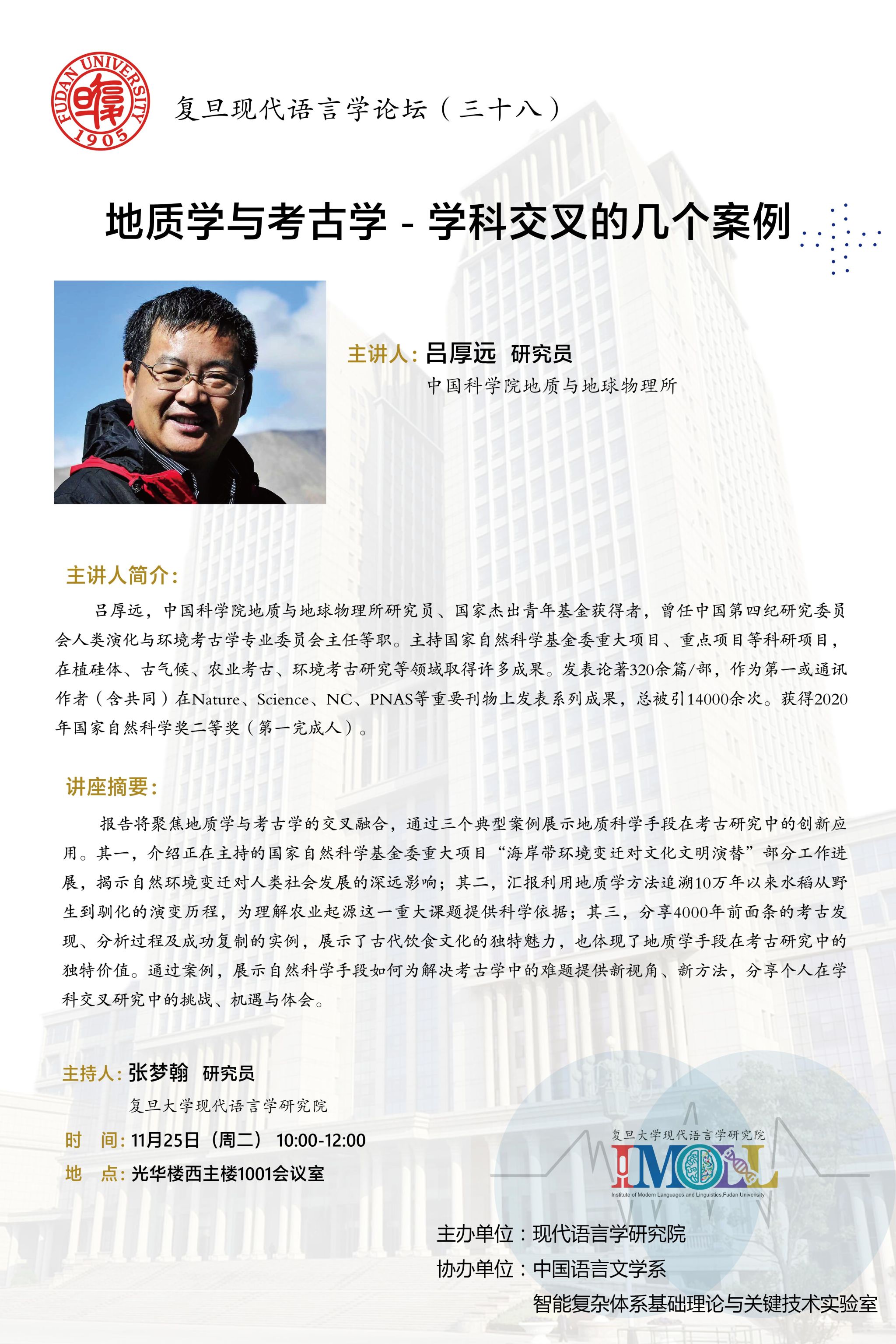 讲座论坛 当前位置: 首 页 > 学术研究 > 讲座论坛 讲座:地质学与考古学-学科交叉的几个案例 浏览量:时间:2025-12-31 复旦现代语言学论坛 复旦现代语言学论坛由复旦大学现代语言学研究院主办。论坛以语言学的跨学科研究为主要特色,不定期邀请国内外知名学者、学界精英共同探讨言语听觉科学、神经语言学、演化语言学、计算语言学、地理语言学等领域的前沿问题。通过跨学科的交流与碰撞,探索现代语言学研究的多元化路径,推动语言学的跨学科发展。